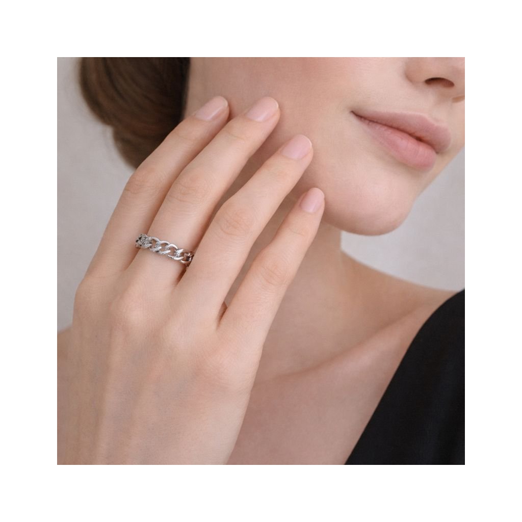 Prsten je inspirovaný řetízkovým motivem, který vytváří vizuálně zajímavý a současně minimalistický efekt. Detailní zakončení a precizní provedení dodávají šperku estetickou hloubku bez zbytečné okázalosti. Design je vhodný pro ženu, která ocení jemné detaily a čisté linie — prsten krásně doplní jiné stříbrné šperky, aniž by působil přeplácaně.
