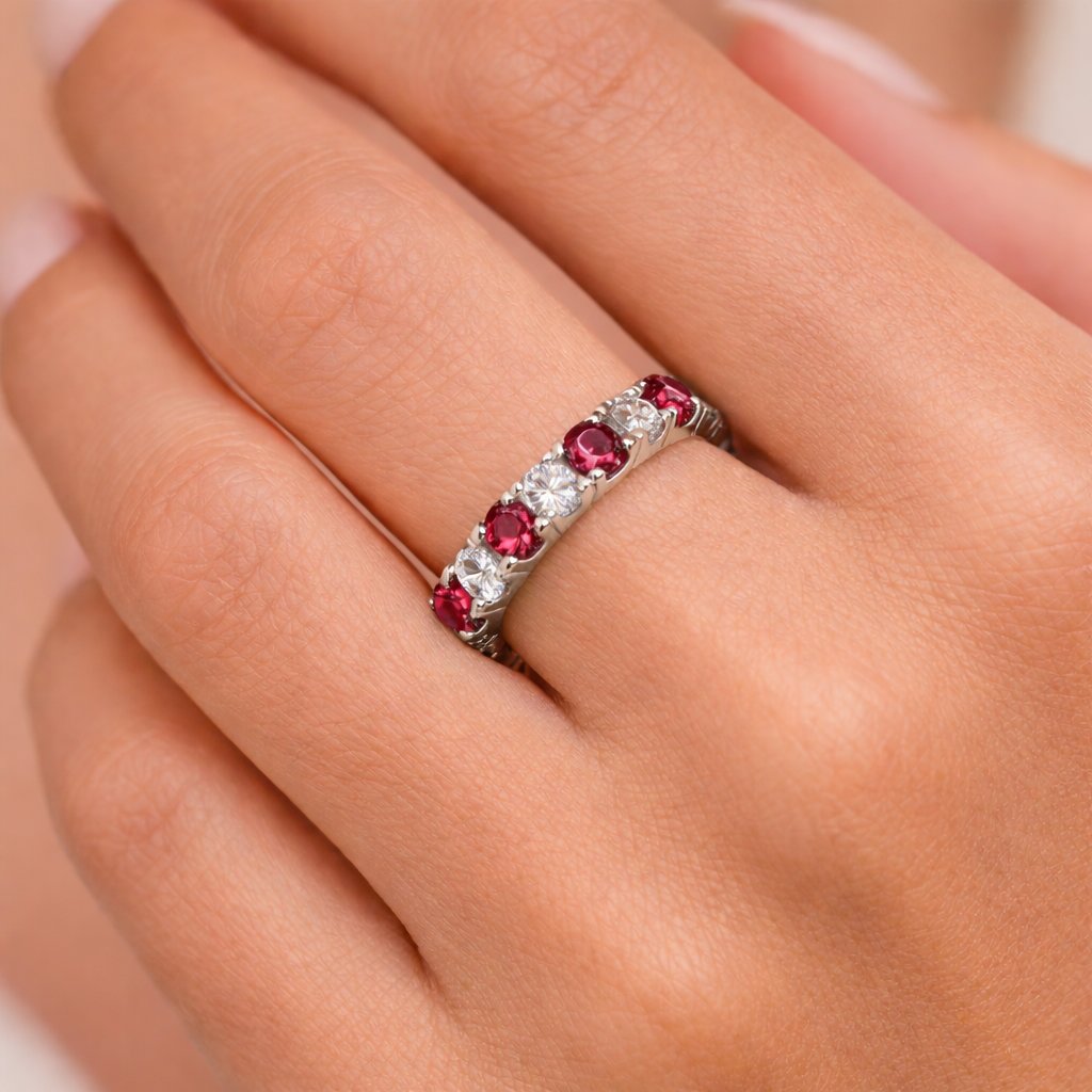 Srdcem prstenu jsou laboratorně vytvořené rubíny, které vynikají svou intenzivní červenou barvou a dodávají šperku osobitý charakter. Rubíny jsou doplněny moissanity — laboratorně vyráběnými drahokamy s vysokým indexem lomu světla a brilancí srovnatelnou nebo často větší než u diamantů. Moissanity vytvářejí ohnivý třpyt a podporují celkovou vizuální dynamiku prstenu.