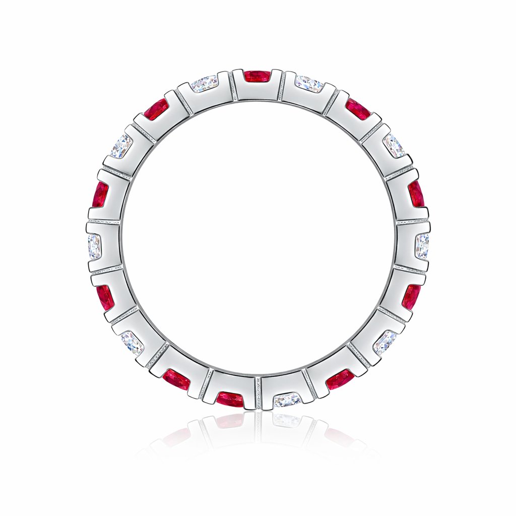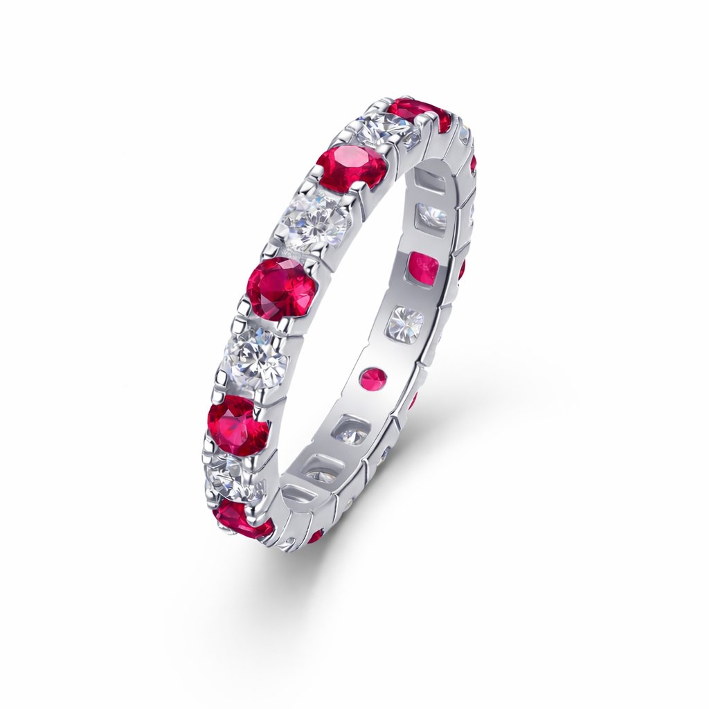 Elegantní stříbrný prsten s laboratorními rubíny a moissanity je působivý šperk, který kombinuje ohnivou červenou barvu rubínu s jiskrou moissanitů.