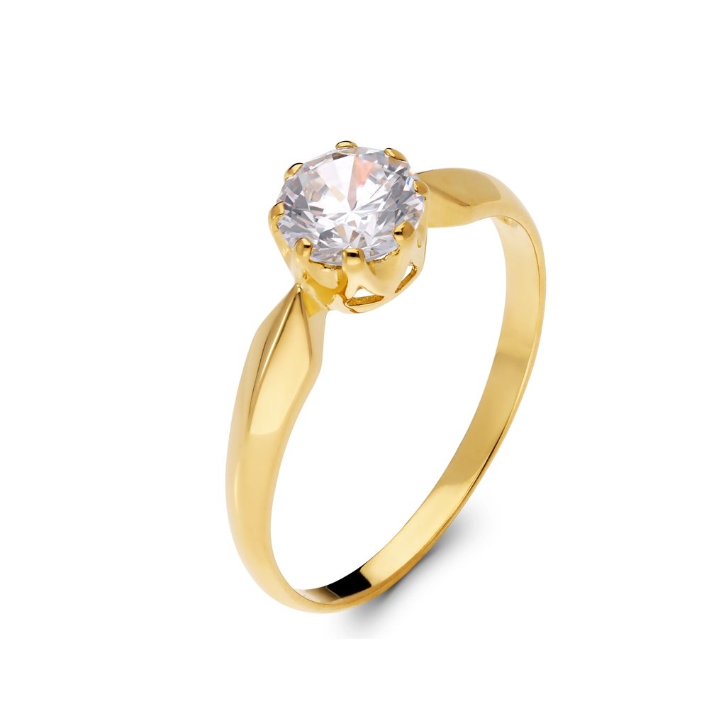 Elegantní prsten je vyroben ze žlutého 14 karátového zlata. Moderní vzor zdobí zářivý zirkon, který je uchycen do korunky pro zachování třpytu a záře centrálního zirkonu s diamantovým brusem. Doporučuji jako zásnubní. Váha prstenu je pouze za zlato bez kamene.