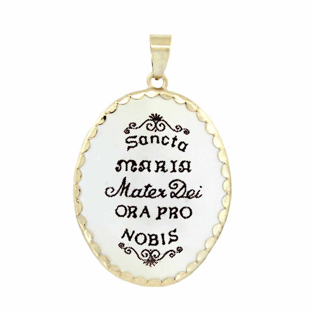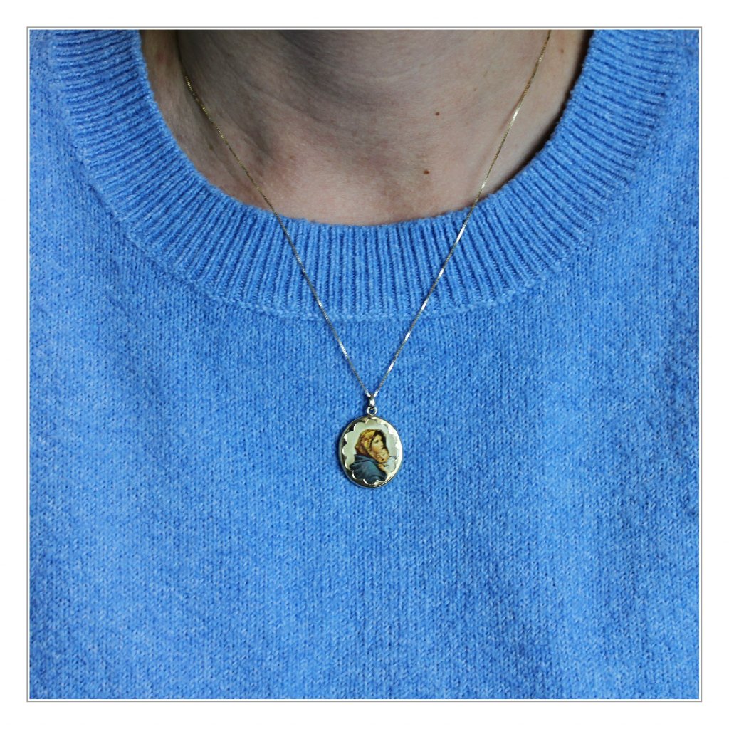 Medailonek zaujme svými precizními detaily vytvořenými technikou smaltování, která přidává jedinečný efekt a barevnou hloubku madončina obrazu. Jeho jednoduchý, ale elegantní design zdobí a dodává šperku unikátní krásu.