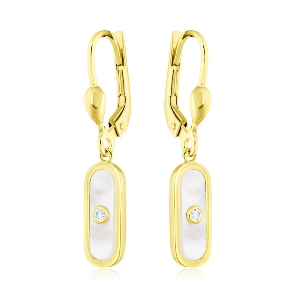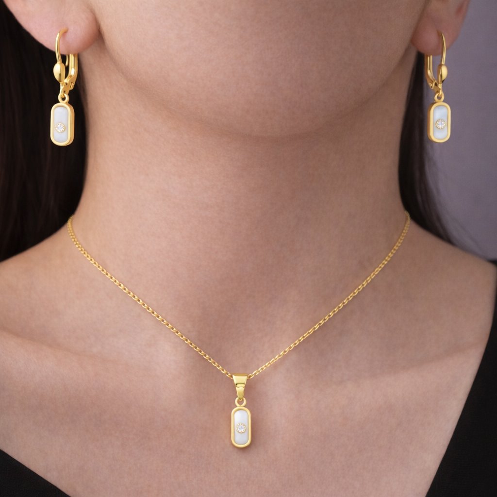 Elegantní zlatá souprava s bílou perletí a zirkonem je harmonicky sladěný šperk, který kombinuje jemné perleťové plochy a třpytivé zirkony v nadčasovém designu.