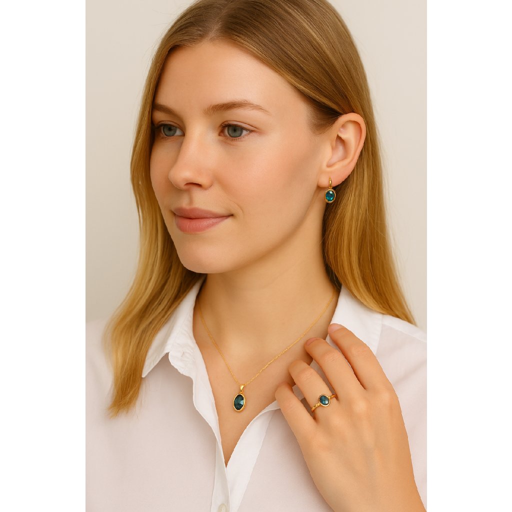 Souprava je vyrobena ze žlutého zlata o vysoké ryzosti a osazena přírodními London Blue topazy. Každý šperk je pečlivě zpracován s důrazem na detail, což zajišťuje dlouhou životnost a pohodlné nošení.