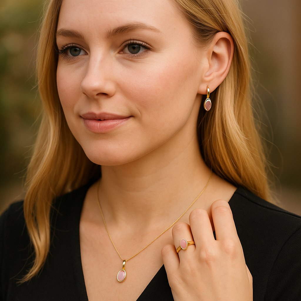 Souprava obsahuje náušnice, přívěsek a prsten, které jsou osazené růženínem – kamenem lásky a harmonie. Každý kus je pečlivě zpracovaný tak, aby vynikl přirozený půvab kamene a jemné linie zlata. Růženín má jemný růžový odstín, který se krásně kombinuje s teplým leskem zlata.