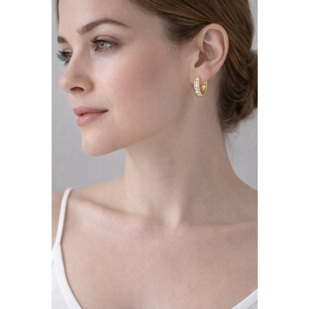 Zlaté kruhy s výraznými zirkony v bílé barvě jsou ideálním doplňkem pro moderní ženu.