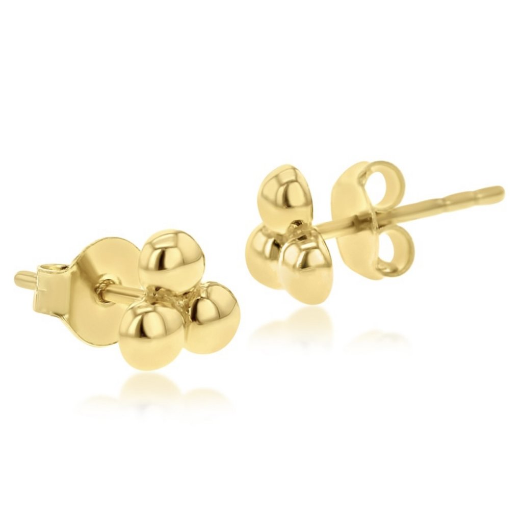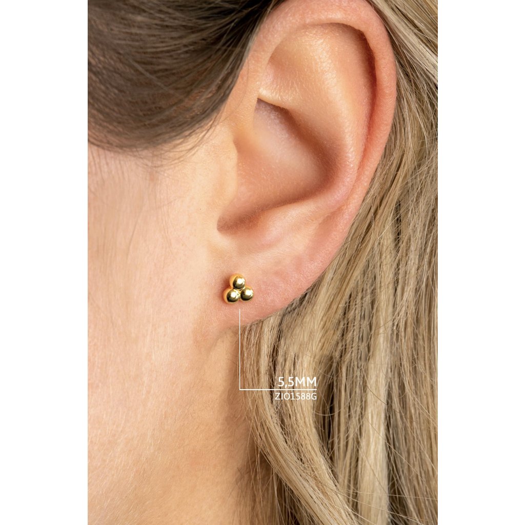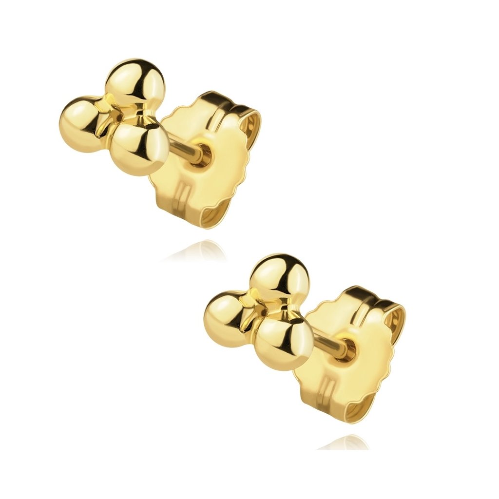 Zlaté náušnice ve tvaru tří malých kuliček působí vkusně a nadčasově díky lesklému povrchu a jednoduchému tvaru.