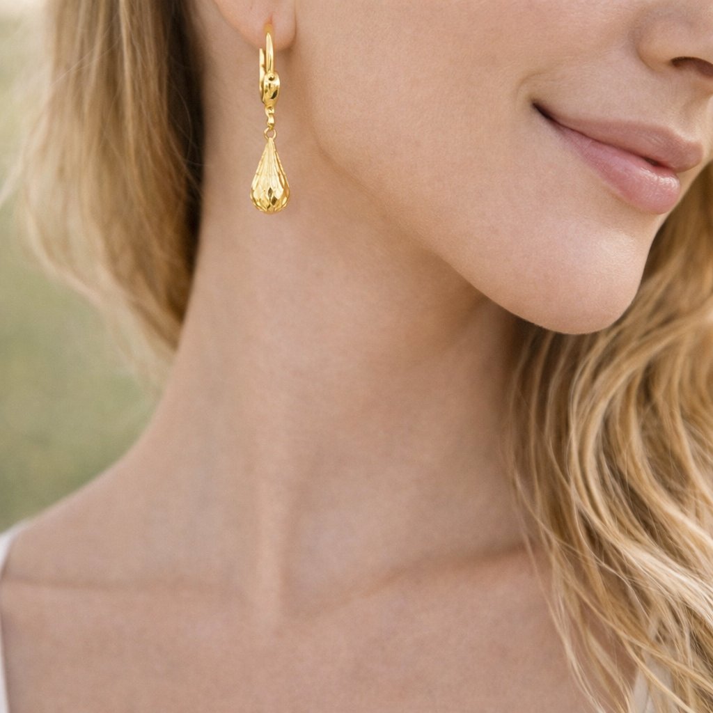 Tvar kapky je oblíbený motiv v šperkařství pro svou harmonii a ženský charakter. Tyto náušnice jsou navrženy tak, aby lesklé zlato v kontrastu s gravírovanými detaily vytvářelo jemný vzor a texturu, která zaujme při každém pohledu. Gravírování je technika, při které se do kovu rytím vytvářejí dekorativní linie či motivy – výsledkem je elegantní a osobitý design, který dodává šperku hloubku a šmrnc.