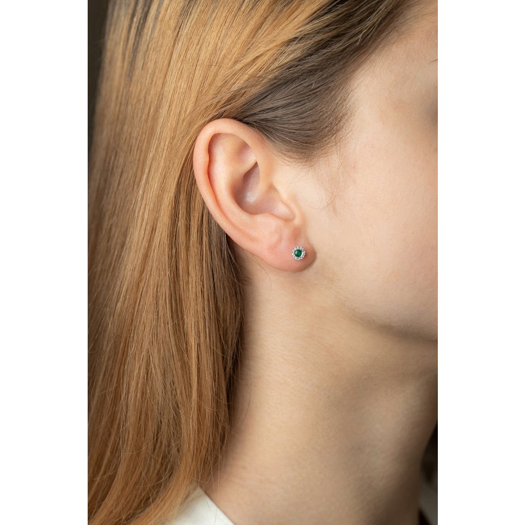 Jemné náušnice v sobě kombinují žluté a bílé zlato. Kruh drobných briliantů dává vyniknout centrálnímu smaragdu v temné zelené barvě.