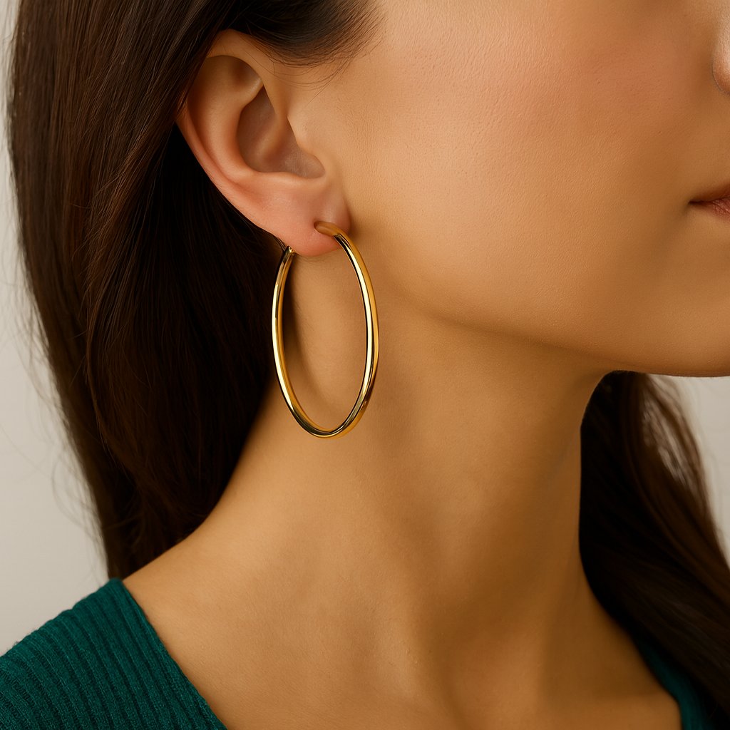 Zlaté kruhové náušnice o průměru 42 mm jsou elegantním a nadčasovým doplňkem pro každou příležitost. Díky své velikosti a kvalitnímu zpracování zaujmou na první pohled a dodají vašemu outfitu sofistikovaný vzhled.