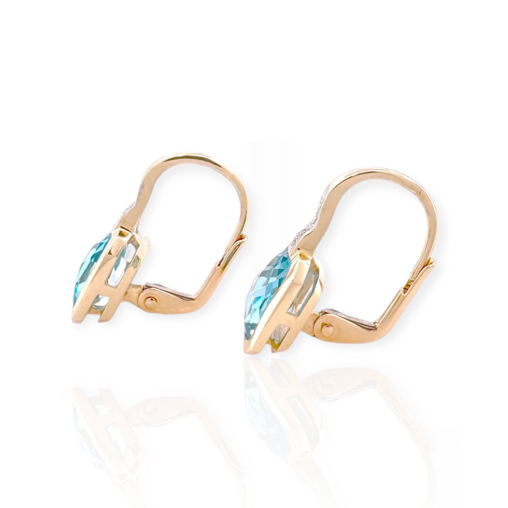 Tyto elegantní zlaté náušnice na klapku spojují klasiku s jemným barevným akcentem — jsou osazeny brilianty (diamanty) a uprostřed zdobeny krásným modrým topazem.