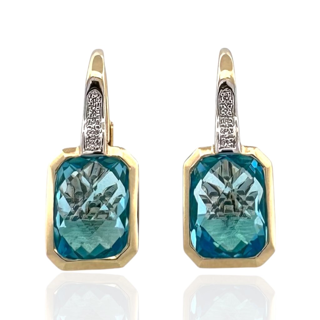 Zlaté náušnice na klapku s diamanty a Blue Topazem