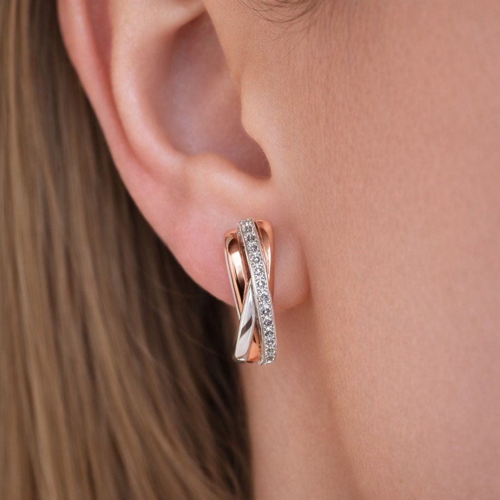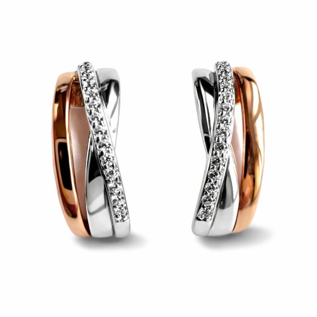 Moderní náušnice z bílého a růžového zlata vynikají svým dvoubarevným provedením a jemným třpytem zirkonů.