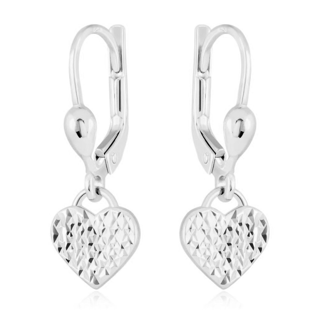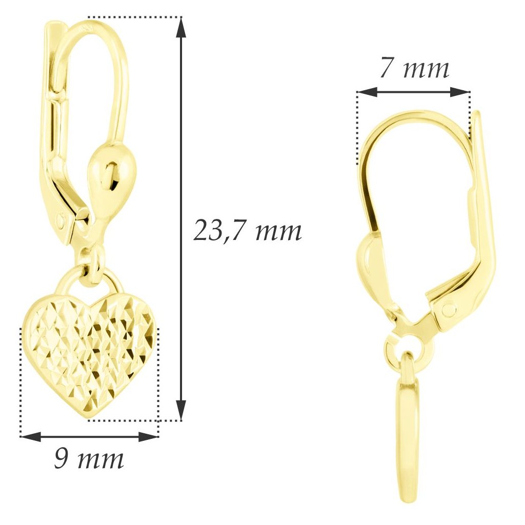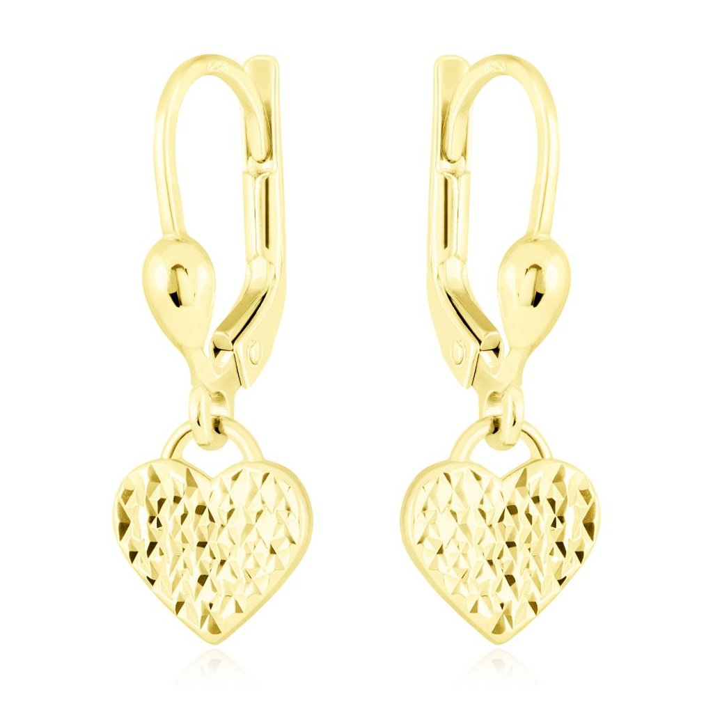 Zlaté visací náušnice s motivem srdíček jsou elegantním a romantickým šperkem, vyrobeným z kvalitního zlata. Každá náušnice se skládá z jemného patentu, který je zakončen nádherným srdíčkem, což dodává náušnicím jemný a ženský vzhled.