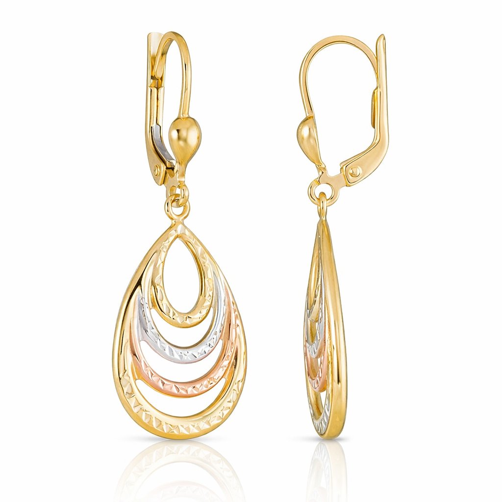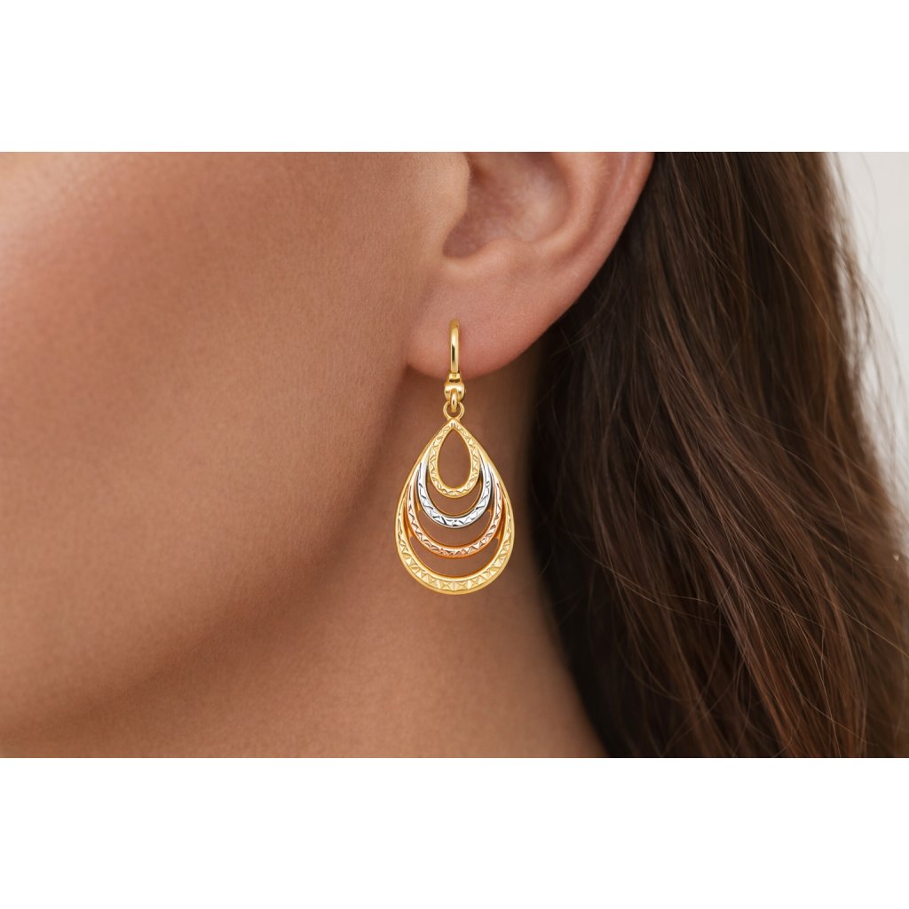 Elegantní zlaté visací náušnice tribarevné jsou působivý a stylový šperk, který kombinuje tři odstíny zlata (žluté, bílé a růžové) ve vyváženém a harmonickém designu. Tato kombinace barev dodává náušnicím hloubku, vizuální pestrost a univerzální vzhled, který se snadno ladí s jinými šperky i různými outfity.