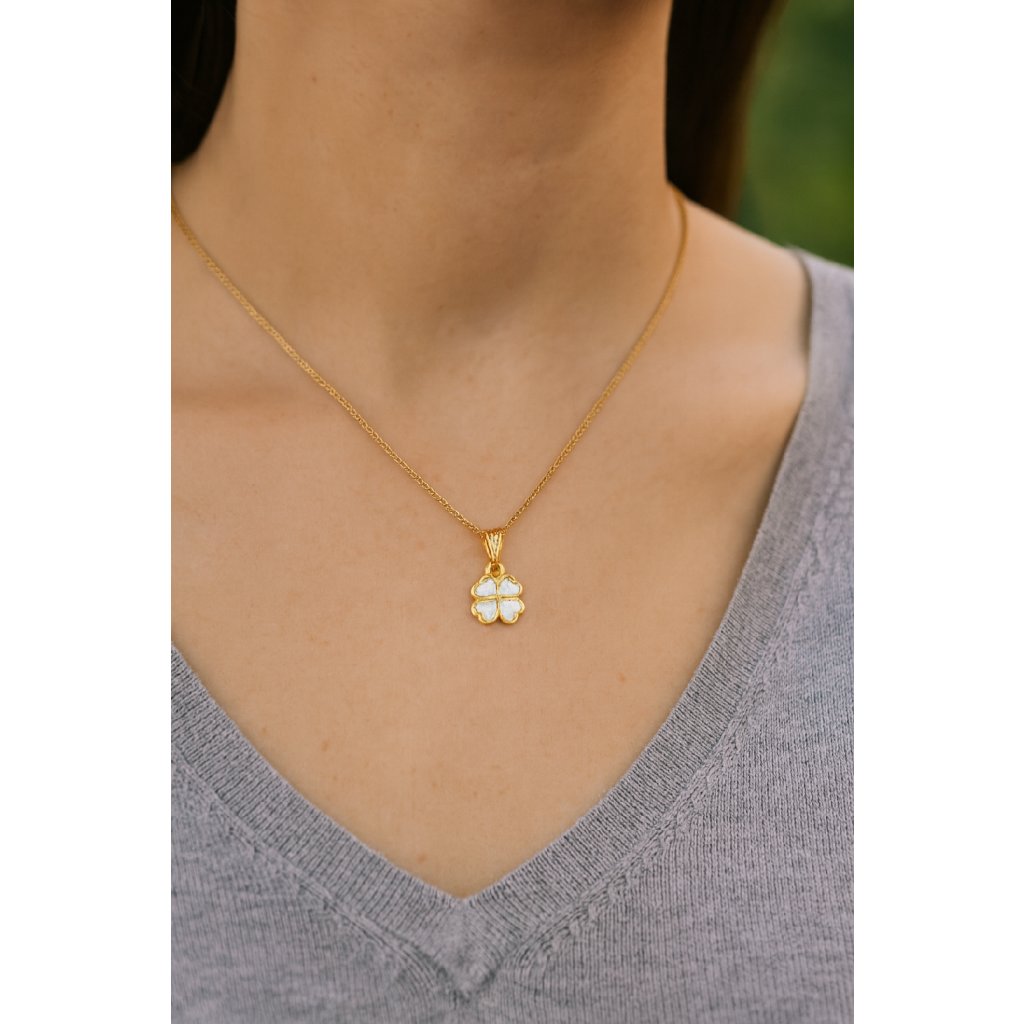 Nechte se okouzlit krásou zlatého přívěsku čtyřlístku – malého talismanu pro štěstí, který zůstane s vámi po celý život.