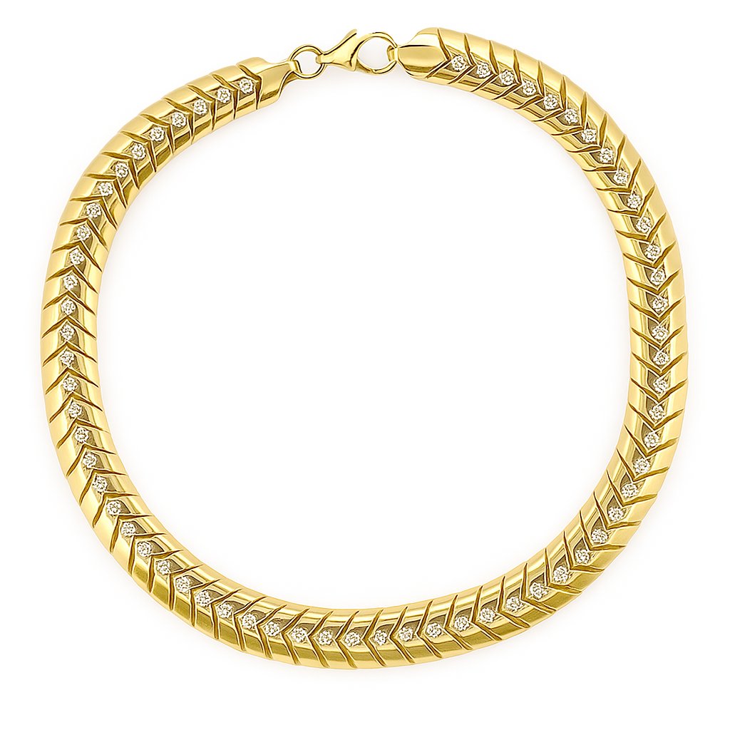 Tento elegantní zlatý náramek osázený zářivými zirkony představuje perfektní rovnováhu mezi jemností a šperkařským luxusem.