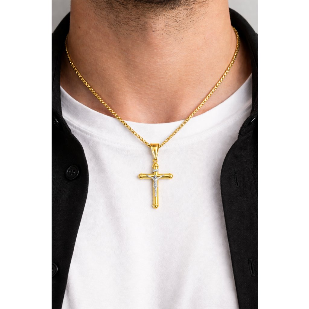 Dvoubarevný zlatý přívěsek ve tvaru kříže s vyobrazbou Ježíše kombinuje klasický symbol víry s elegantním zpracováním z dvou odstínů zlata.