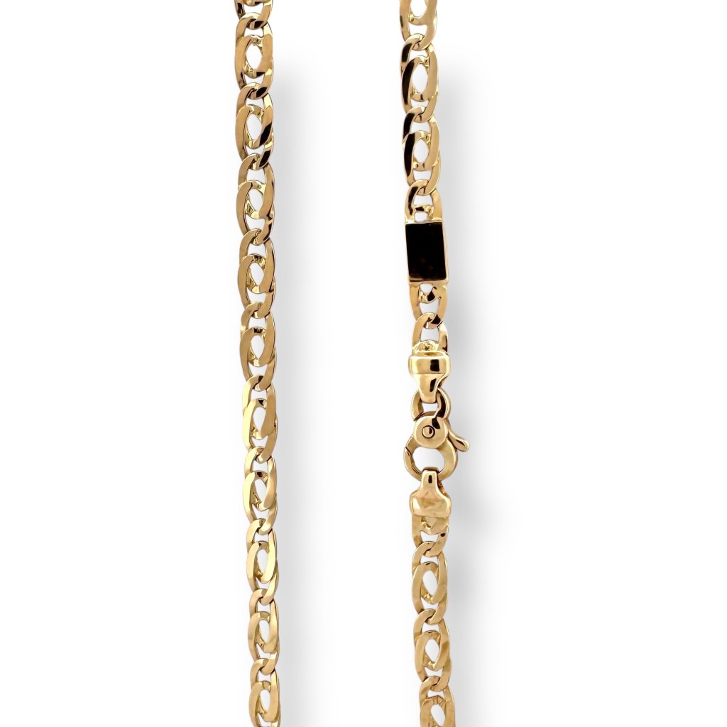Náhrdelník je vyroben ze žlutého zlata ryzosti Au 585/1000, což odpovídá běžnému standardu šperků vysoké kvality. Díky svému objemu (15,82 g) a oválnému pancérovému provedení nabízí pevnost a robustnost bez kompromisu na pohodlí. Povrch je leštěný, aby vynikl lesk zlata a umožnil, že každé očko odráží světlo elegantně a výrazně.