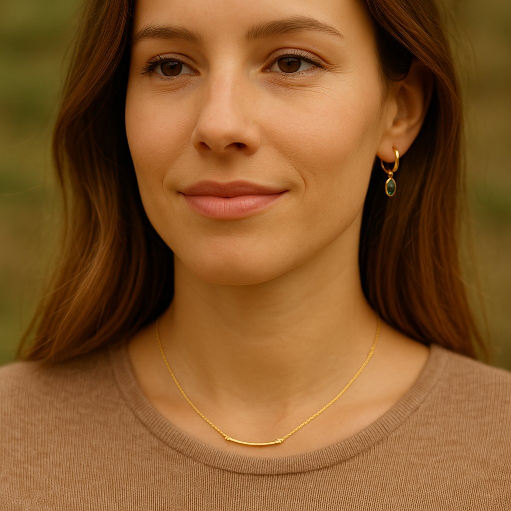 Minimalistický design s tenkou horizontální tyčkou dodává šperku nadčasový vzhled, který podtrhne jemnost i sebevědomí. Díky univerzální délce a decentnímu stylu skvěle ladí jak s každodenním, tak i slavnostním outfitem.