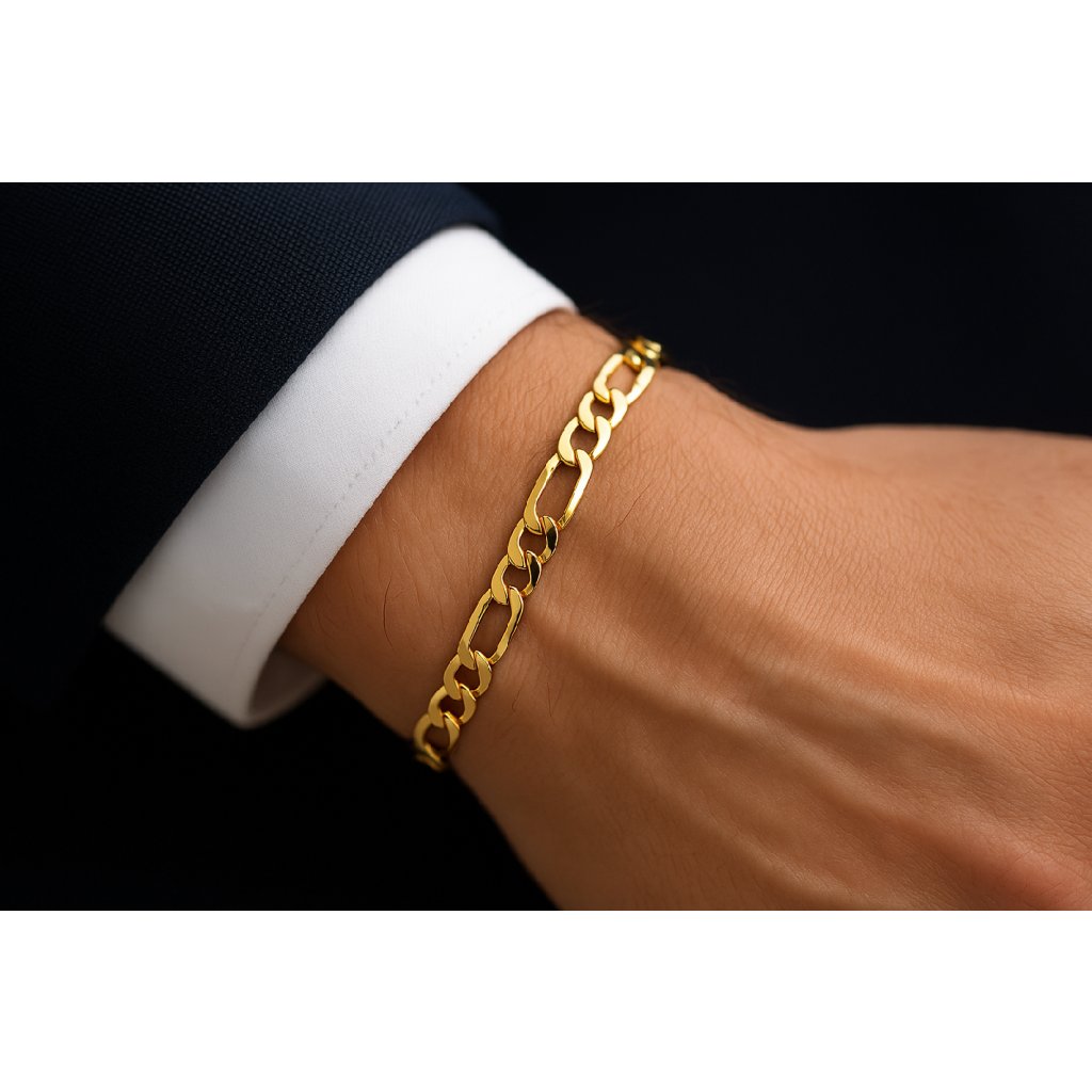 Tento elegantní náramek typu Figaro 3+1 zaujme jemnou strukturou trojice menších a jednoho většího očka, která se periodicky střídají. Design je nadčasový a vhodný pro obě pohlaví — přináší stylovou rovnováhu mezi jemností a výrazem. Lesklé provedení a precizní spojení článků dodává zápěstí sebevědomý akcent, který vhodně doplní jak denní outfit, tak slavnostní vzhled.