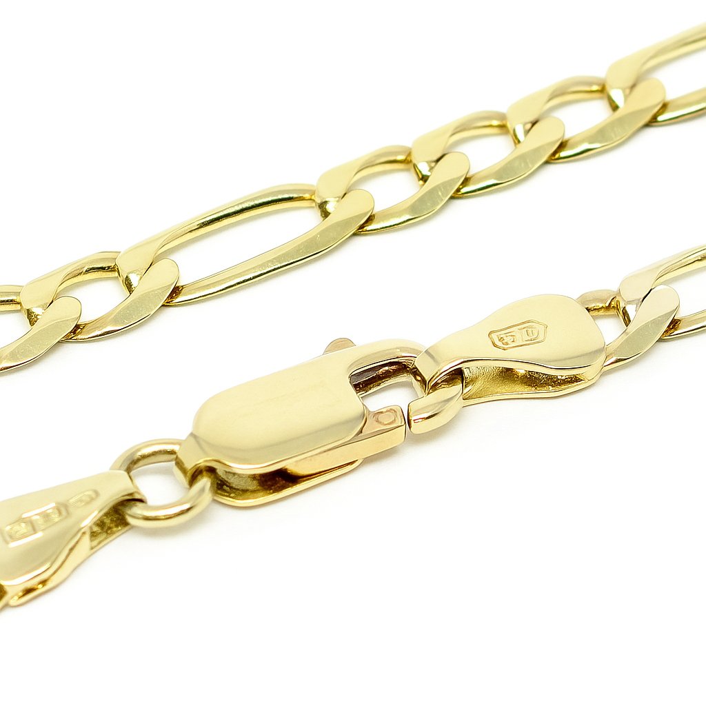 Náramek je vyroben z pravého zlata ryzosti 585/1000 (14 karátů). Povrchová úprava je vyleštěná pro dosažení vysokého lesku, který podtrhuje charakter vzoru Figaro. Konstrukce je navržena pro pohodlné nošení i dlouhodobou odolnost.