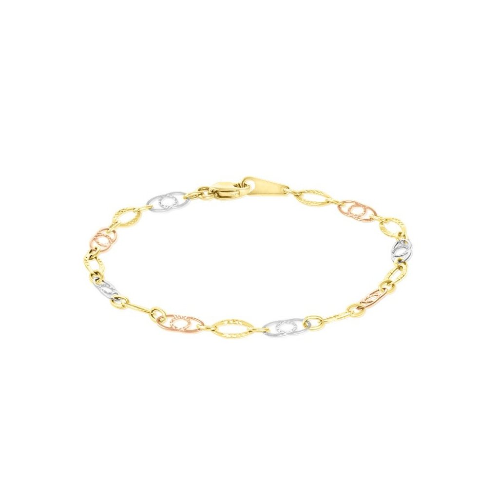 Elegantní zlatý náramek ve 3 barvách zlata s gravírováním je nadčasový a stylový šperk, který kombinuje žluté, bílé i růžové zlato ve vyváženém designu.
