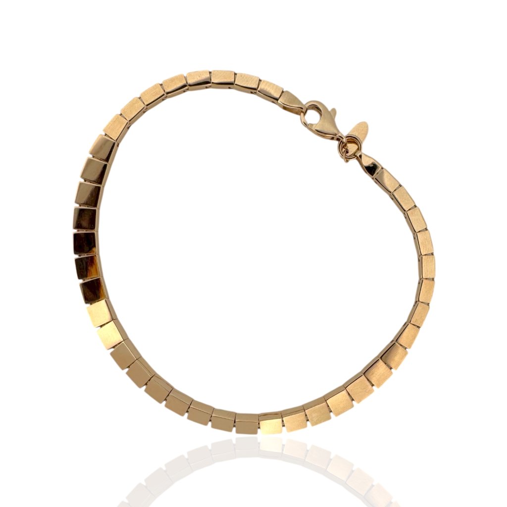 Tento zlatý náramek kostky zaujme svým decentním, ale geometricky zajímavým návrhem. Náramek sestává z pravidelně řazených drobných “kostek”, které vytvářejí harmonický řetězec.
