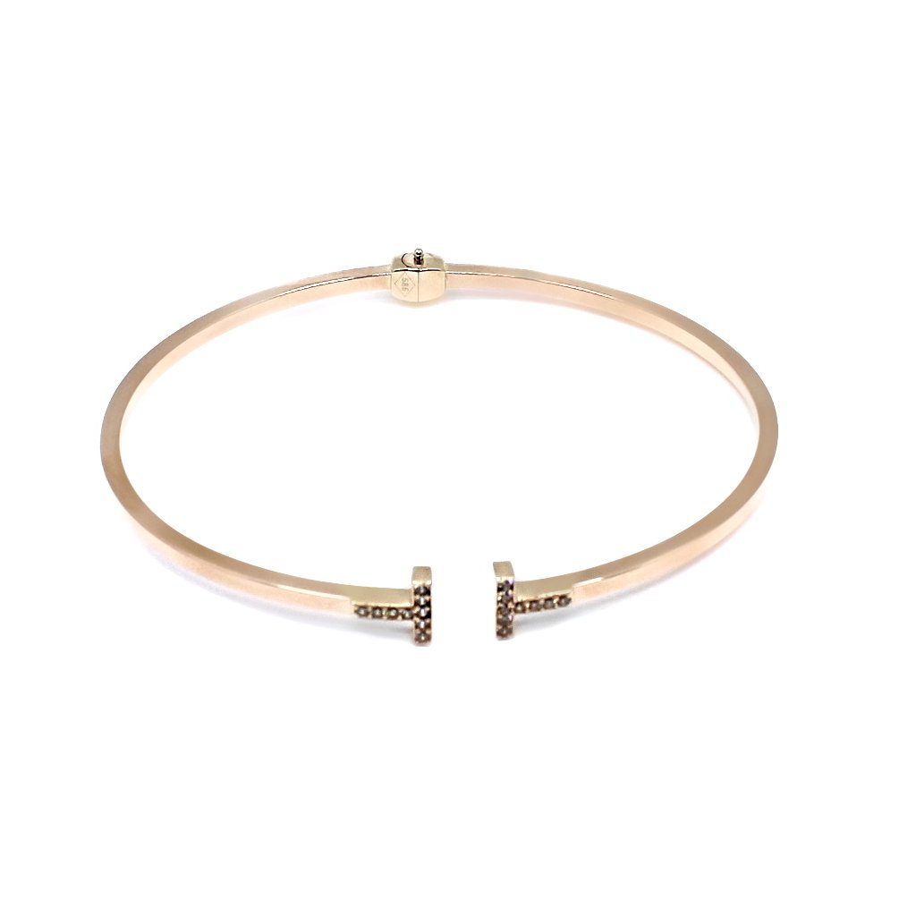 Nadčasové čisté linie pevného náramku s ozdobou ve tvaru T. Náramek je možné jednoduchým pohybem otevřít a nasadit na zápěstí.
