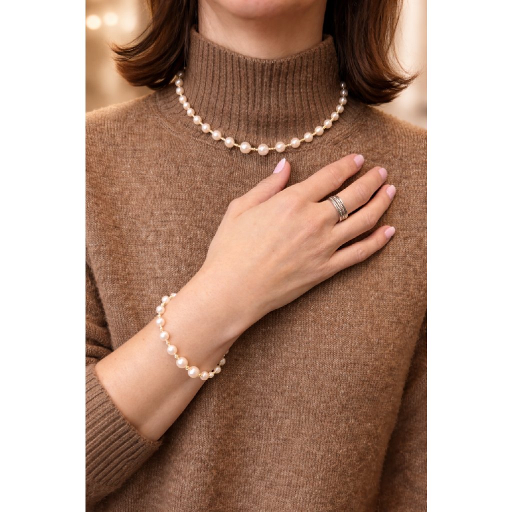 Náramek je tvořen pravidelně navlečenými perlami, které vytvářejí harmonický a velmi elegantní celek. Perly Akoya pocházejí převážně z Japonska a jsou známé svou jemnou barvou a intenzivním leskem, který krásně odráží světlo . Díky svému provedení působí šperk luxusně a hodí se pro každodenní nošení i slavnostní příležitosti.