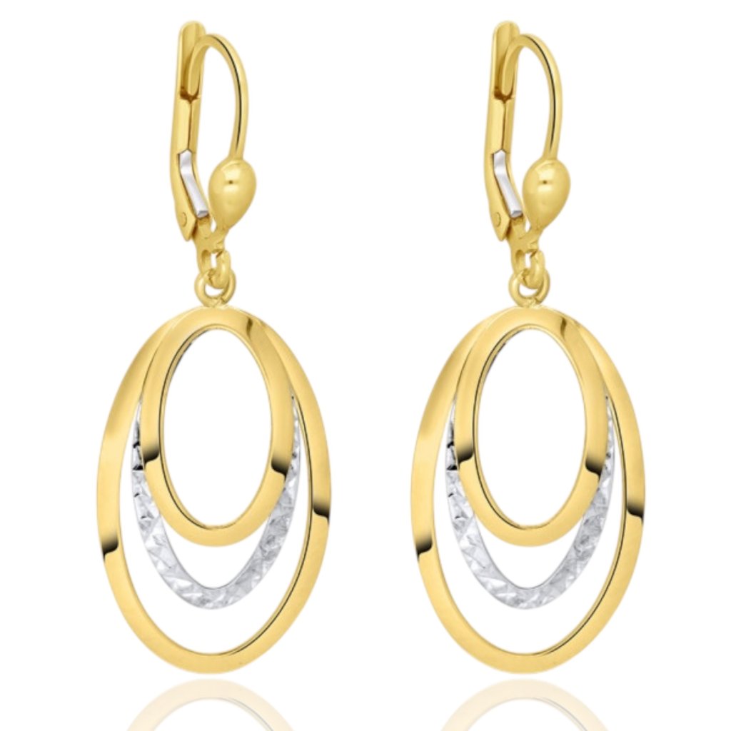 Oválný přívěsek z 14 karátového zlata v kombinaci žlutého a bílého tónu. Nadčasový design, hladký povrch a univerzální elegance pro každou příležitost. Výrazný šperk, který podtrhne ženský půvab. Nabízíme náušnice ve stejném stylu.