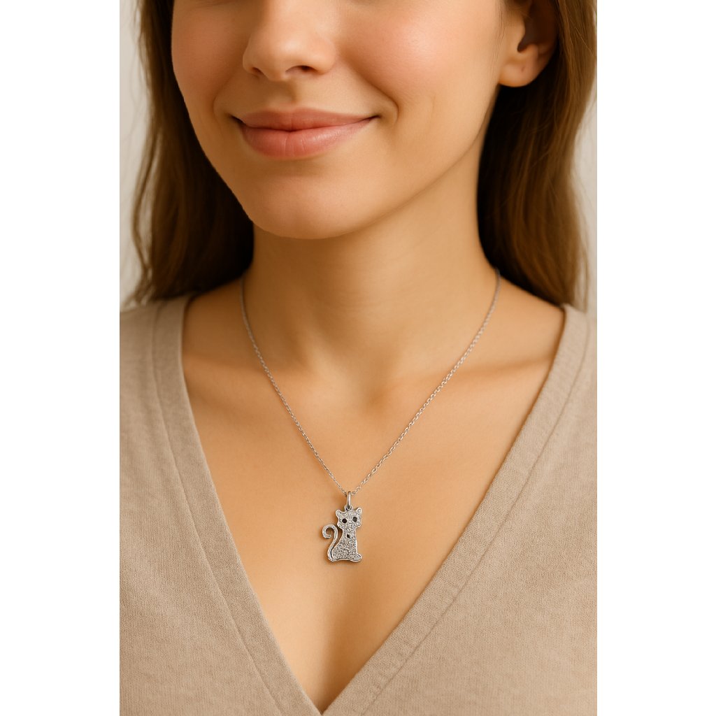 Přívěsek znázorňuje stylizovanou siluetu kočky, jejíž tělo je ozdobeno precizně zasazenými zirkony. Ty dodávají šperku nádherný třpyt a luxusní vzhled. Díky svému jemnému designu je tento přívěsek vhodný pro každodenní nošení i speciální příležitosti.