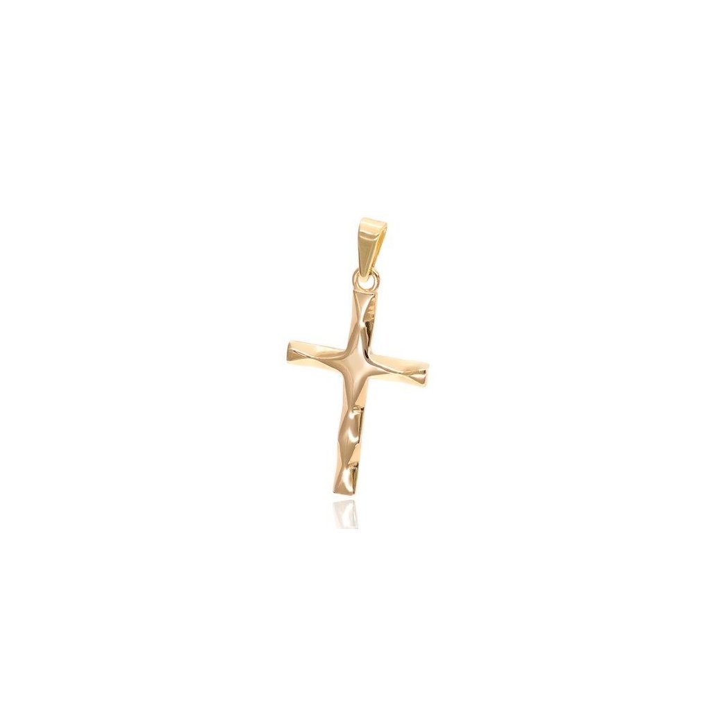 Tento originální přívěsek v podobě kříže vyniká strukturou „mačkaného“ povrchu, která vytváří zajímavý hru světla a stínu na lesklém žlutém zlatě.