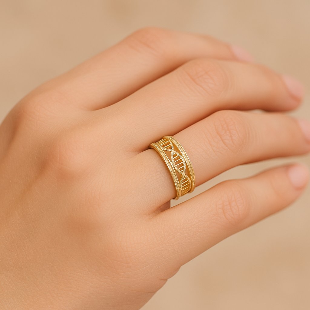 Vyroben z kvalitního zlata, tento prsten nabízí odolnost a dlouhotrvající lesk. Precizní zpracování materiálu zajišťuje dokonalý tvar a detailní provedení motivu DNA. Zlatý povrch je elegantní a nadčasový, vhodný pro různé příležitosti.