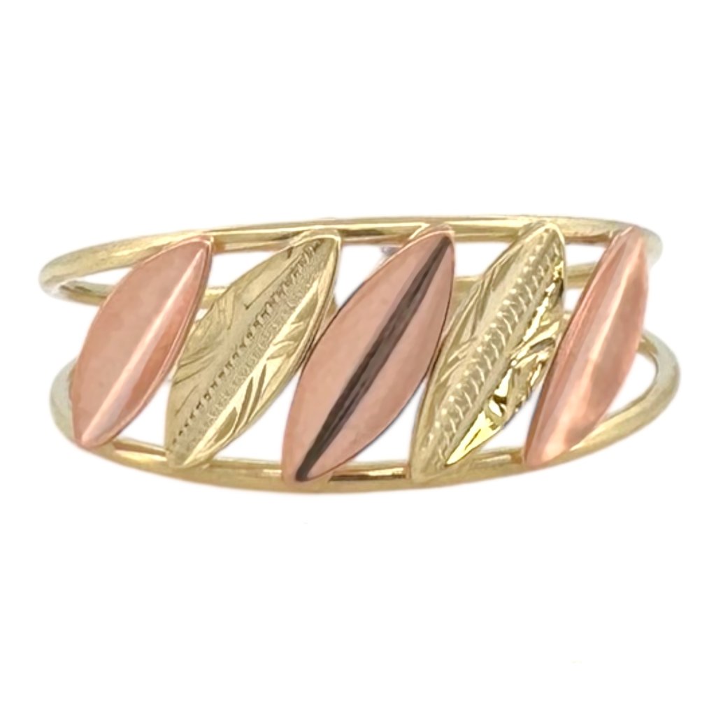 Tento prsten je vyroben ze žlutého a růžového zlata, což vytváří harmonickou kombinaci barev. Jemné lístky zdobí povrch prstenu, čímž mu dodávají přírodní a elegantní vzhled.