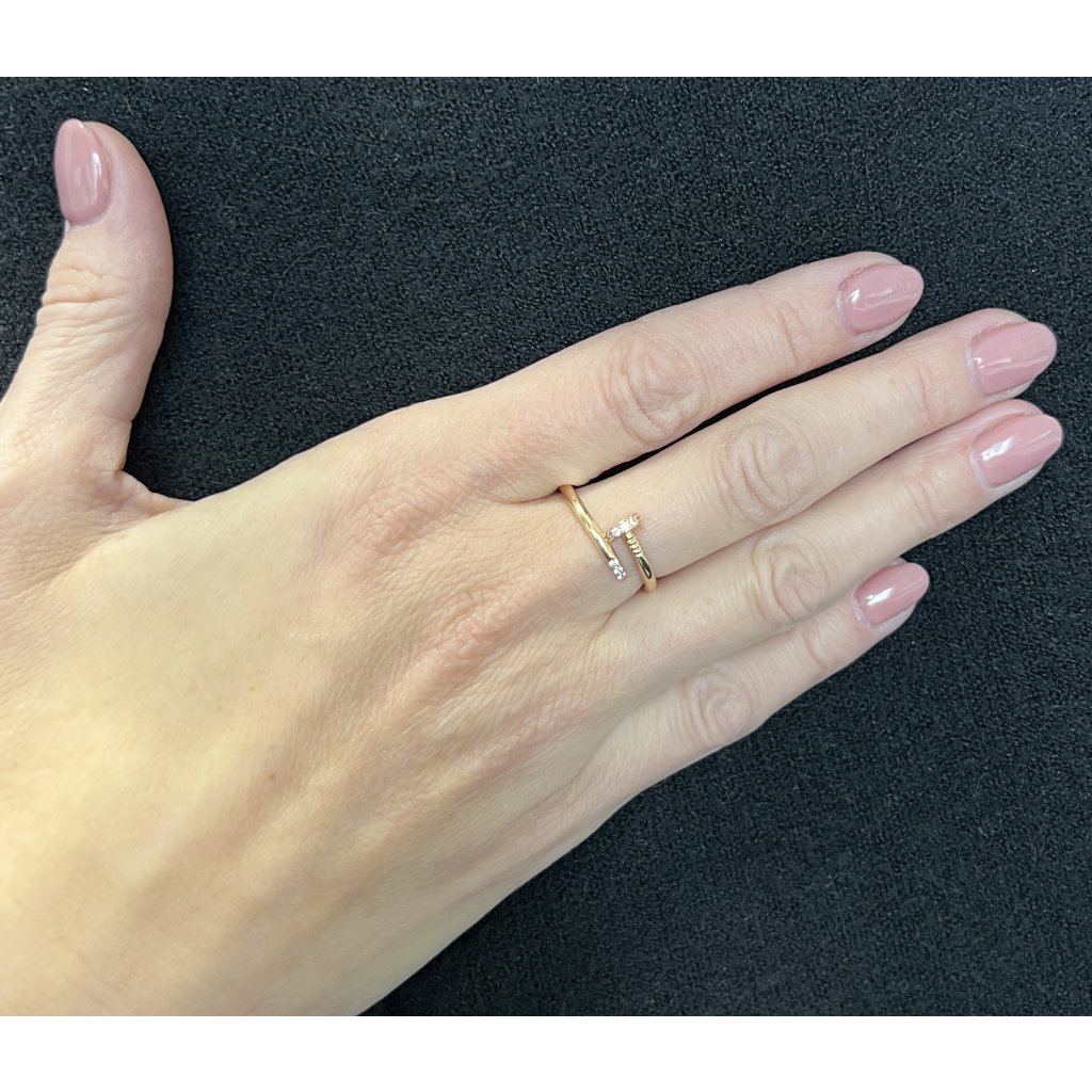 Prsten je navržen s důrazem na jemnost a eleganci. Dominantním prvkem je osazení bílou kubickou zirkonií, která šperku propůjčuje decentní třpyt a sofistikovaný vzhled. Kámen je přesně zasazen do zlatého korpusu, což zajišťuje jeho bezpečné uchycení a dlouhou životnost. Růžové zlato je vysoce leštěné, což podtrhuje celkovou eleganci prstenu a zajišťuje jeho zářivý lesk.