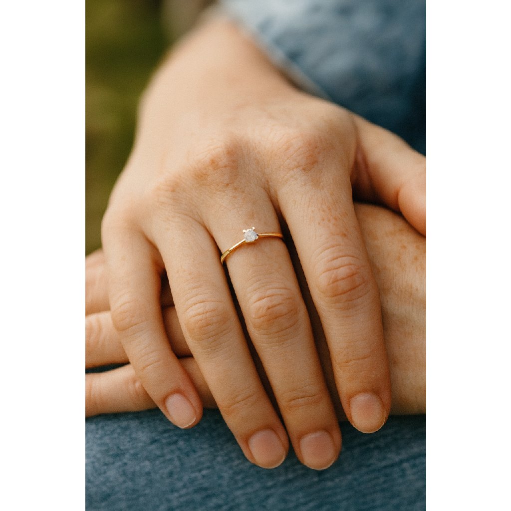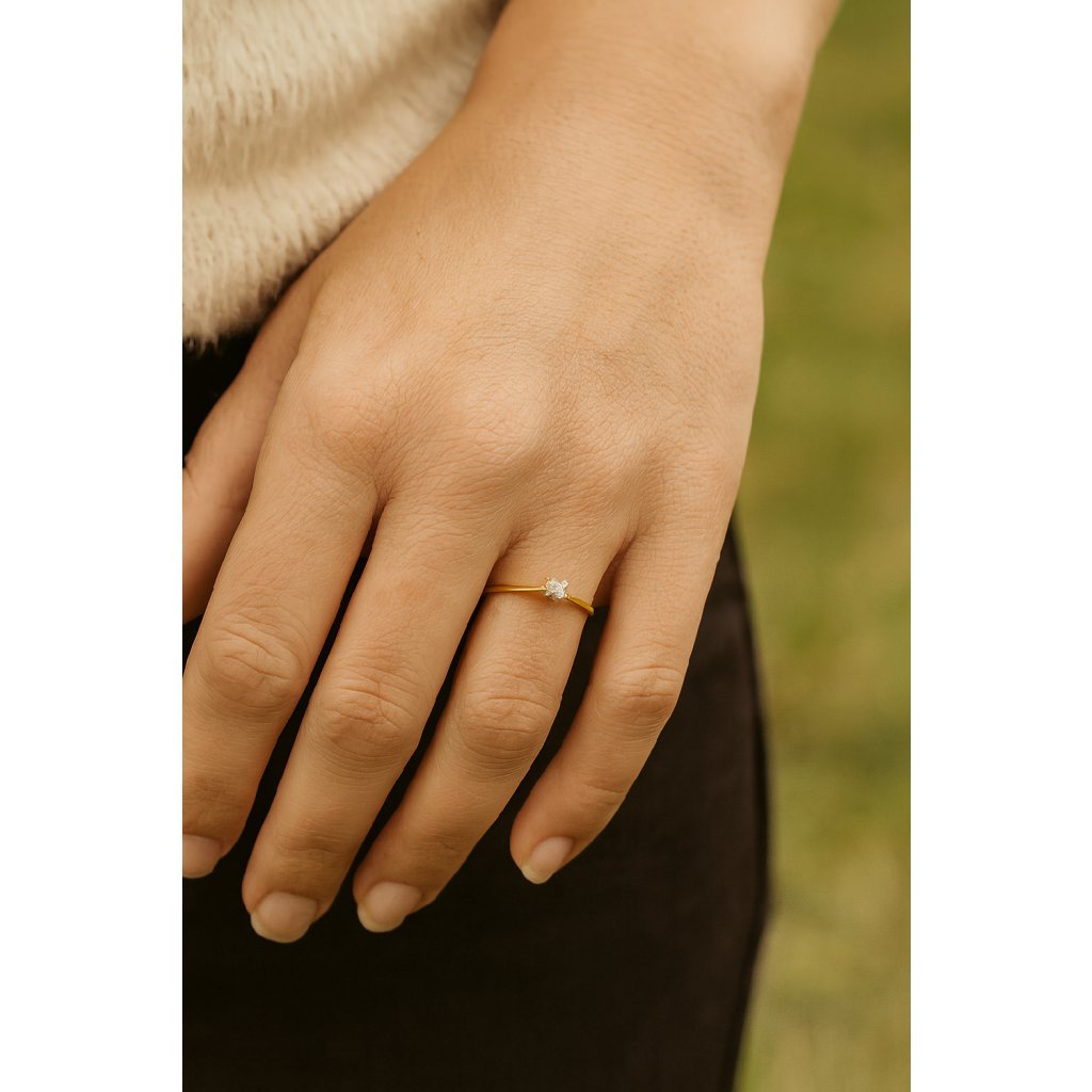 Prsten je vyroben z kvalitního zlata, které zaručuje jeho trvanlivost a lesk. Dominantou šperku je diamant o hmotnosti 0,12 ct, který je známý svou brilancí a čistotou. Precizní zasazení diamantu dodává prstenu sofistikovaný vzhled, který se hodí k jakékoliv příležitosti.