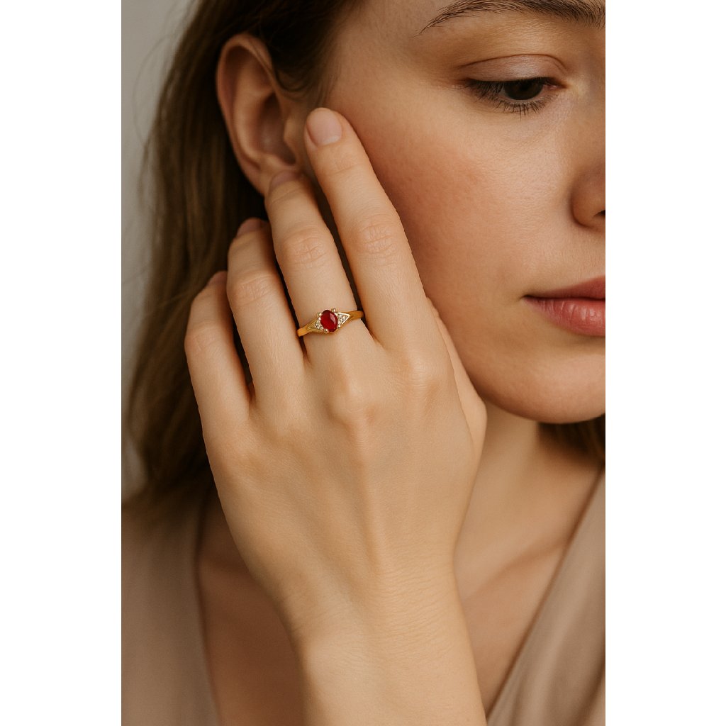 Vyroben z kvalitního zlata a zdobený rubínem a diamanty, tento prsten je vysoce ceněným šperkem. Rubín představuje vášeň a sílu, zatímco diamanty dodávají prstenu zářivý lesk a noblesu.