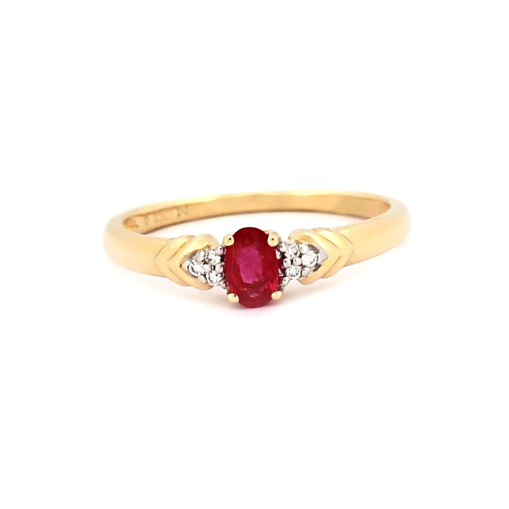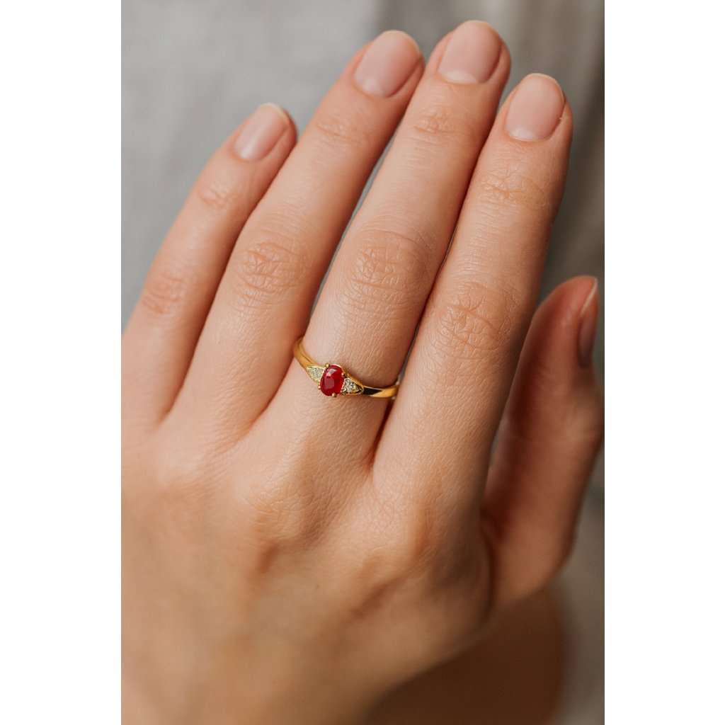Prsten představuje spojení tradiční elegance s moderním půvabem. Jeho jemné linie a lesklý povrch zlata vytvářejí harmonické prostředí pro rubín a diamanty, které jsou umístěny s precizností a dokonalým vkusem.