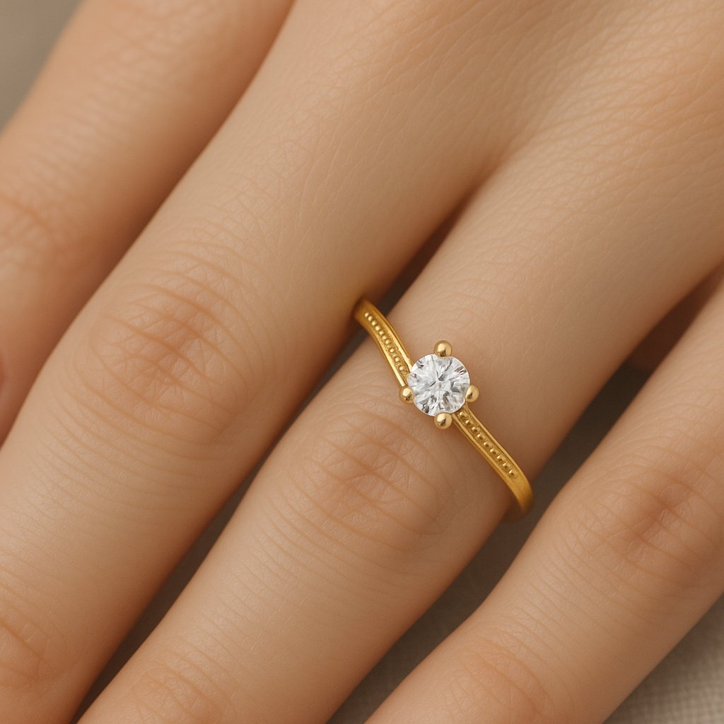 Prsten je vyroben ze žlutého nebo bílého zlata ryzosti čtrnáct nebo osmnáct karátů, díky čemuž si dlouhodobě udrží lesk a odolnost proti opotřebení. Jasný zirkon, připomínající diamant, je pečlivě broušený aby zachoval přirozený třpyt.