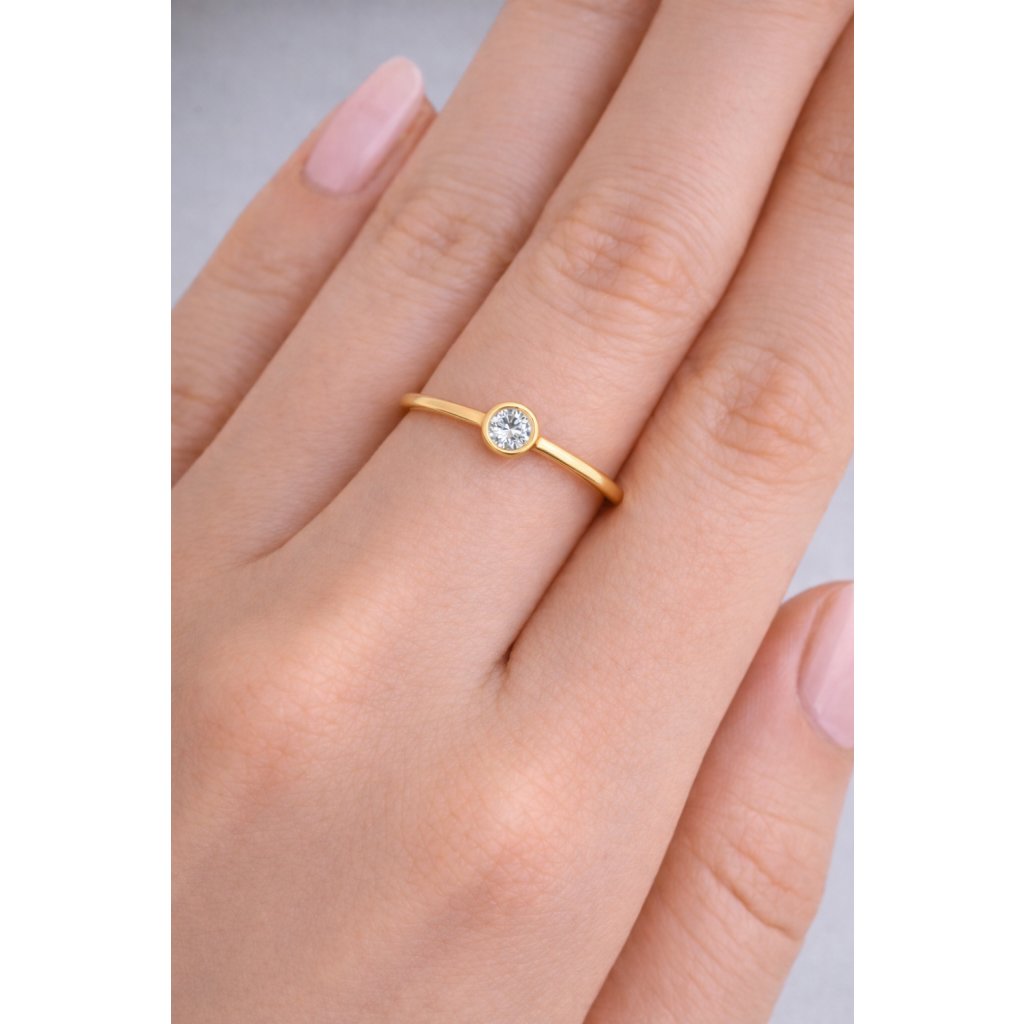 Dominantou prstenu je kulatý čirý zirkon pevně zasazený do hladké obruby, která jej zároveň chrání před poškozením. Díky tomuto provedení působí prsten velmi elegantně a zároveň prakticky pro každodenní nošení. Lesk kamene krásně vyniká na lesklém povrchu zlata.