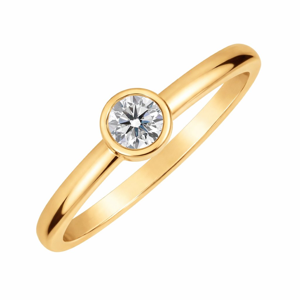 Zlatý prsten se zirkonem v kulaté obrubě zaujme elegantním a nadčasovým designem s dominantním třpytivým kamenem.