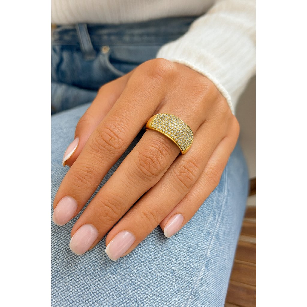 Luxusní široký zlatý prsten zdobený třpytivými zirkony, které mu dodávají oslnivý vzhled. Ideální pro ženy, které milují elegantní a výrazné šperky.