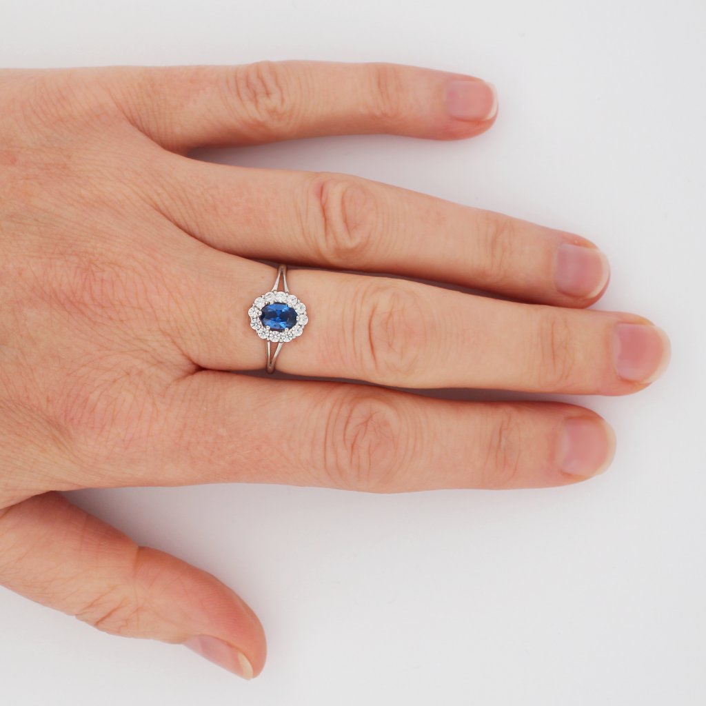 Zlatý prsten z bílého zlata se zirkony a safírem Kate