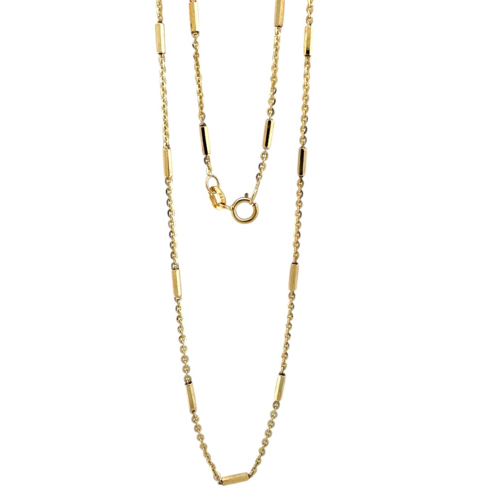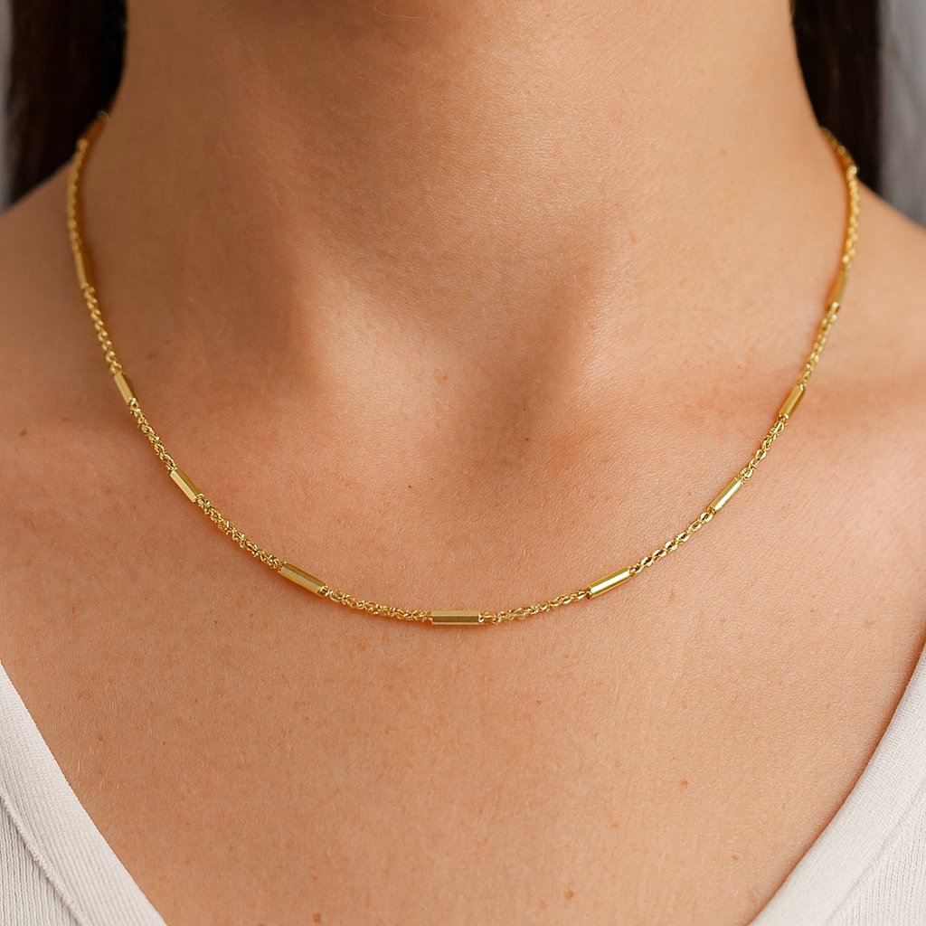 Řetízek kombinuje klasické ankerové články s moderními válcovými prvky — díky tomu působí čistě a elegantně. Díky zlatému provedení přináší teplý a luxusní nádech, který nepůsobí nápadně, ale stylově. Je vhodný pro ty, kdo hledají diskrétní a trvanlivý doplněk s klasickou siluetou.