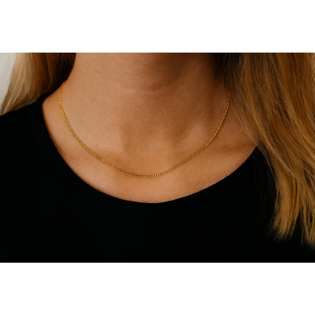 Tento jemný zlatý řetízek ve vzoru pletený o délce 55 cm spojuje klasickou eleganci s nadčasovým stylem. Propletená konstrukce oček vytváří hladký, ale strukturovaný povrch, který krásně odráží světlo a dodává šperku jemný lesk.