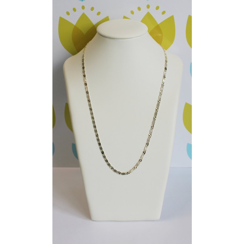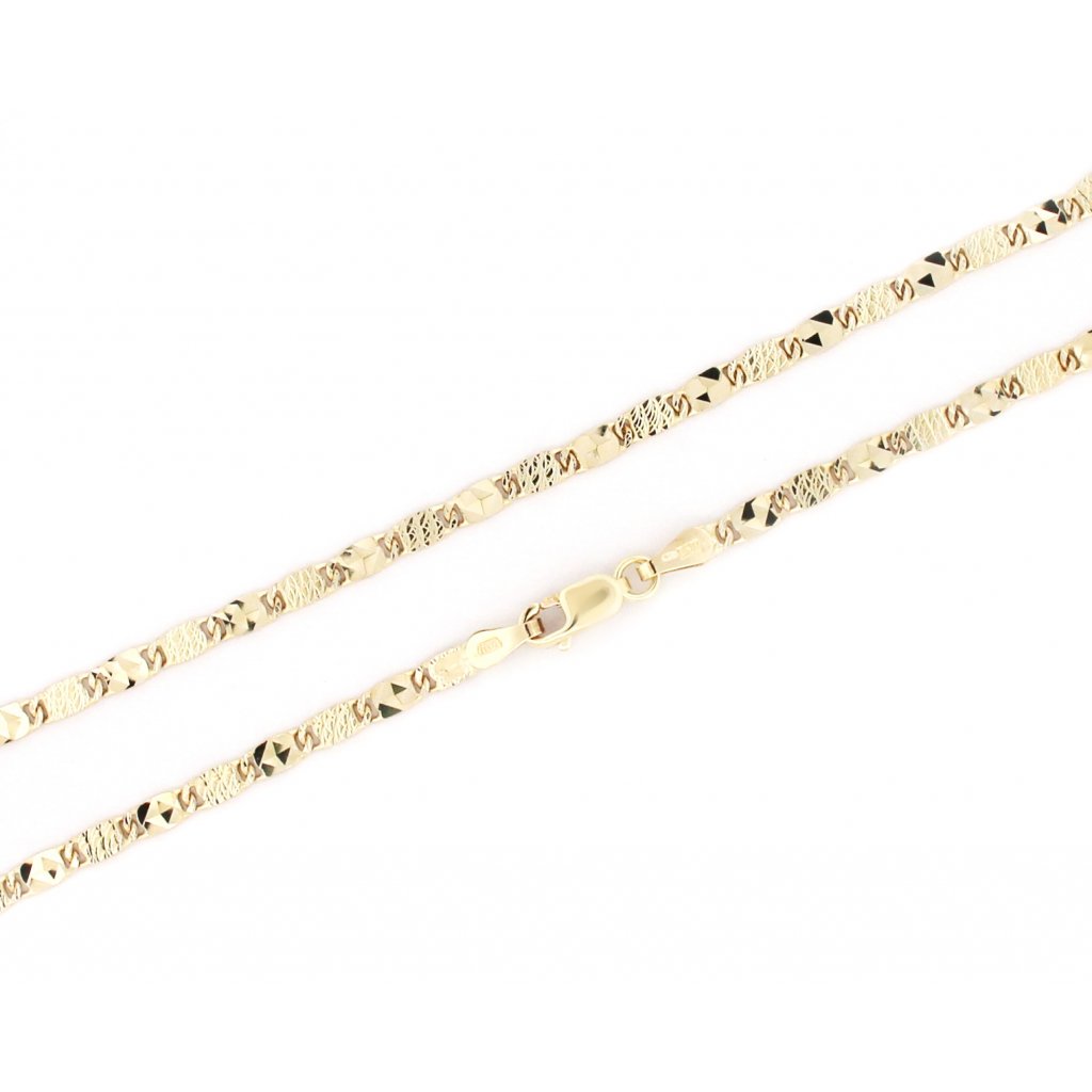 Tento silný zlatý řetízek s destičkami má výrazný a robustní design. Destičky rozmístěné po celém řetízku mu dodávají unikátní vzhled, který z něj dělá atraktivní a stylový doplněk. Je vhodný jak pro samostatné nošení, tak v kombinaci s přívěskem.